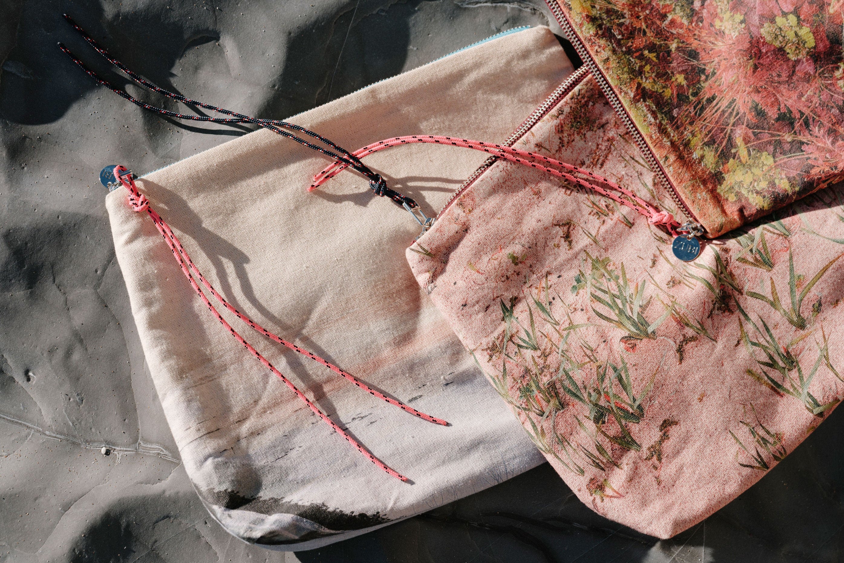 Cada estampado recoge algo de esos lugares: flores que podrían crecer junto al camino, arenas suaves, rocas erosionadas, horizontes limpios. Bolsos pensados para llevar lo justo, para acompañar el día. Algodón, cordina, colores que no compiten con lo que pasa alrededor.