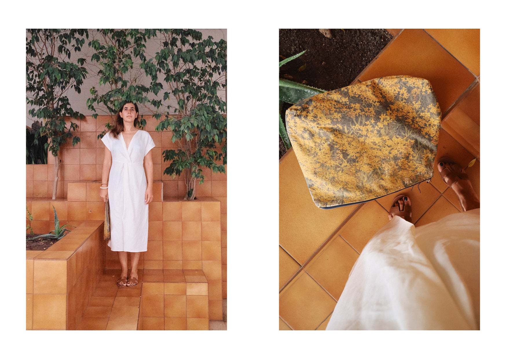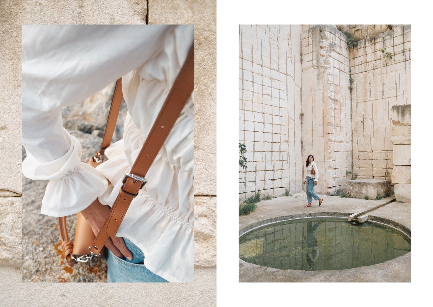 Garments that appear in the photos of the zubi collection: white ingrid blouse / leather loop bag / blue siska denim / black andratx top / daisy pouch / elin striped linen shirt / white linen daphne dress / mimosas pouch / rakel parka