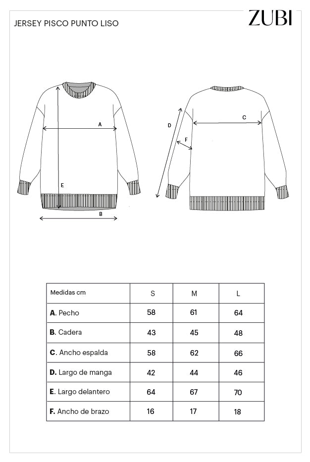 Diseñado con un corte amplio que no se ajusta en exceso al cuerpo, presenta cuello redondo, hombro caído y acabados en rib de canalé en puños, escote y bajo. Tiene aberturas laterales y un largo equilibrado, igual en delantero y espalda, que aporta comodidad y versatilidad.