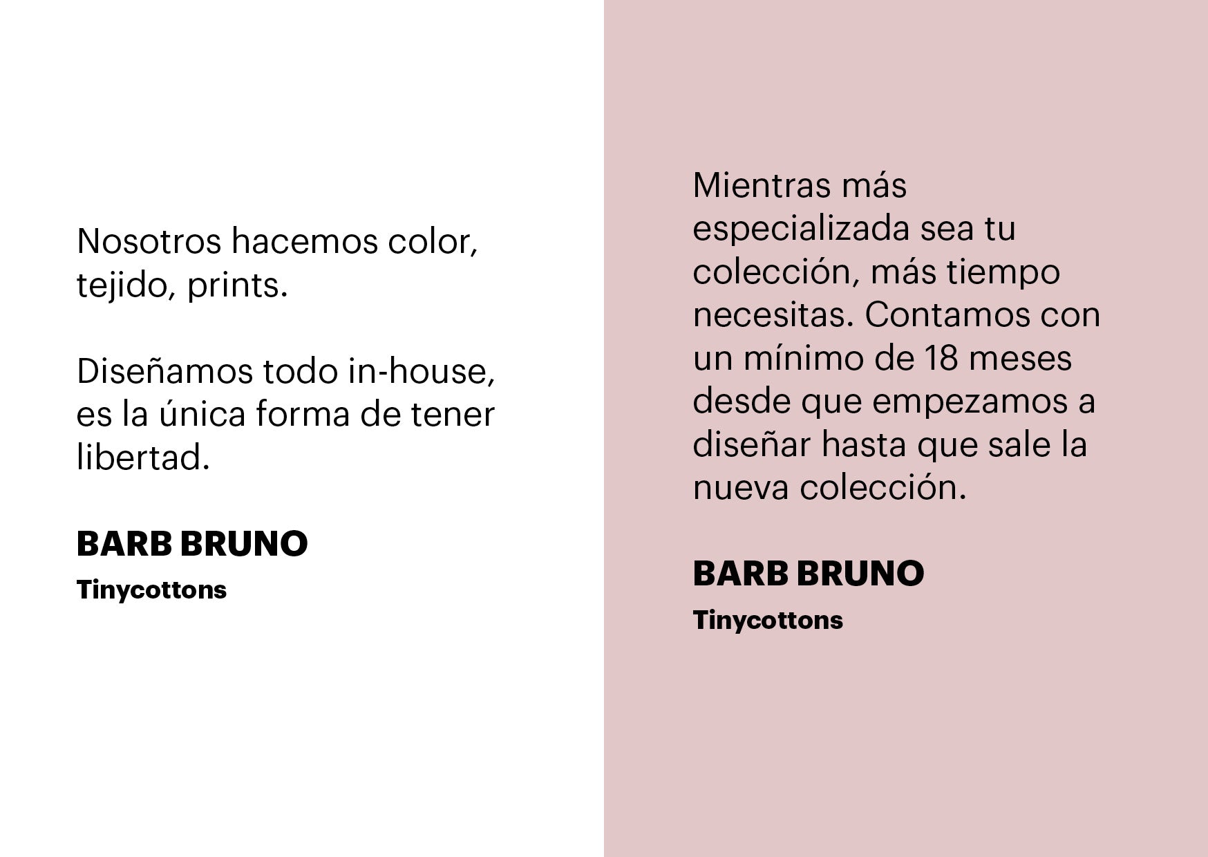 Tuvimos la suerte de conocer a Barb Bruno hace un tiempo y es una de las personas que más nos ha inspirado y que nos ha contagiado mayor energía en los últimos años. No hay palabras suficientes para agradecer su generosidad a la hora de compartir métodos de trabajo propios, experiencias y un conocimiento extraordinario del sector, especialmente, del proceso creativo a la hora de crear una colección.