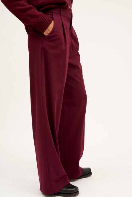 Annie es un pantalón de talle alto y pierna palazzo, con dos pinzas frontales que crean pliegues delicados a lo largo de la pierna. Su corte elegante, bolsillos laterales y falso bolsillo trasero lo convierten en una prenda sofisticada y versátil.