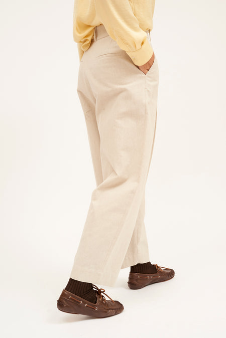 Martina es nuestro nuevo pantalón icónico. De silueta arquitectónica y carácter definido, con largo al tobillo y bolsillo francés. Está confeccionado en canvas de algodón orgánico certificado, con botón en cinturilla y pliegues que además de dar estructura favorecen al aplanar la zona del vientre, adaptándose maravillosamente a todas las figuras.