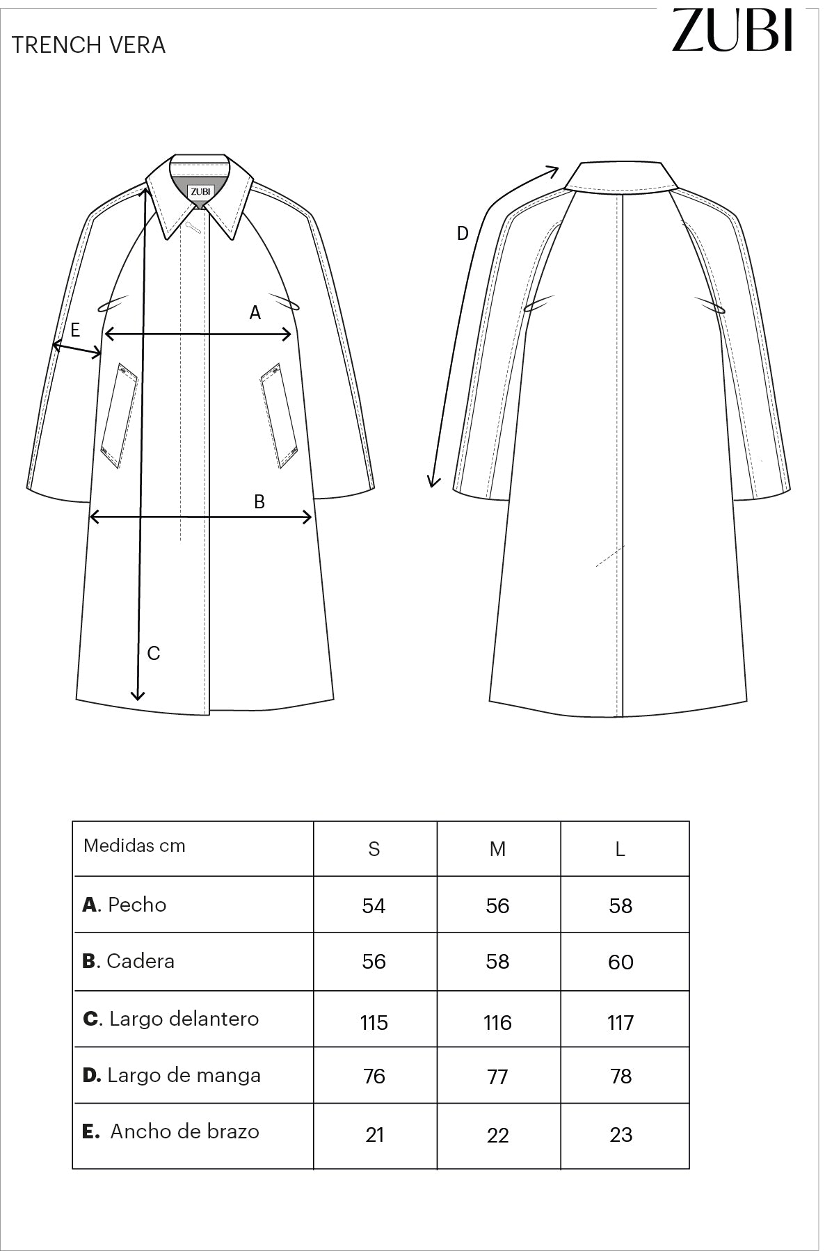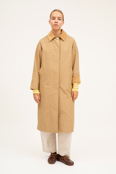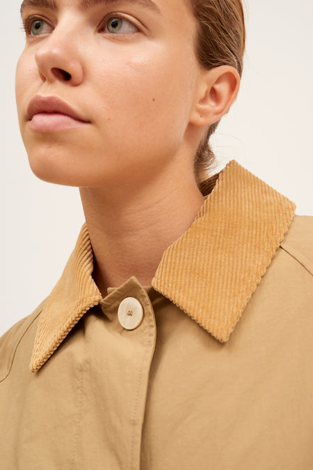 De corte ligeramente oversized, largo por debajo de la rodilla, manga ranglan, cuello camisero y puños en pana. Tiene bolsillos laterales, abertura trasera, cierre frontal con tapeta y botones tipo cuerno ocultos, además de canesú interior y mangas forradas al tono.