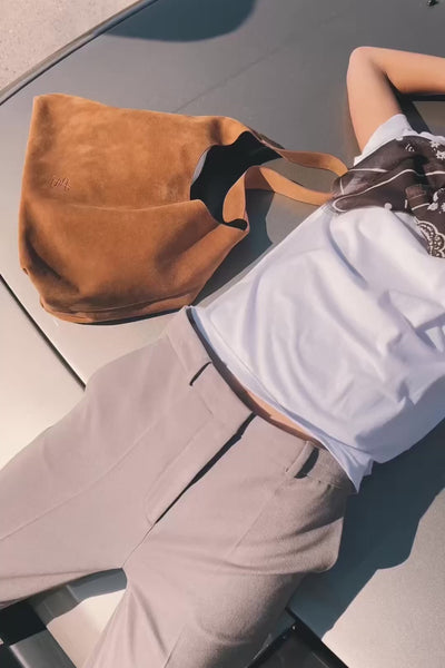 Está confeccionado en piel de serraje de vacuno, con base rectangular y un asa continua en forma de “U” que nace de los laterales, además de un cierre de mosquetón en la parte superior. Incluye forro con efecto nobuk, bolsillo interior de serraje y un asa amplia para llevarlo cómodamente incluso con abrigos voluminosos.